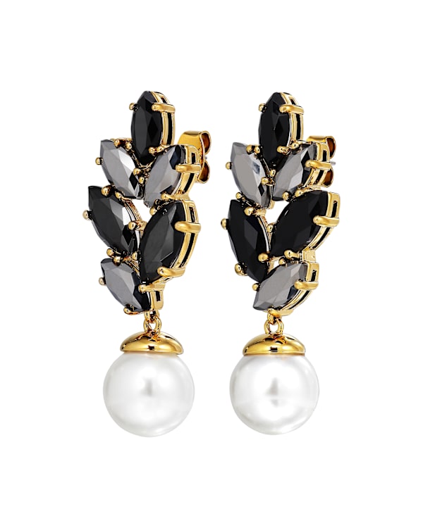 BALETE är ett härligt, feminint och elegant örhänge som kommer att se bra ut för större och mindre sammankomster. Den bladformade överdelen helt översållad med navetteformade kristaller i olika toner bär en större vit imitationspärla. Smyckena är designade i polerad mässing med kirurgiska hål i öronen. Längden är ca 40 mm. Här visas i guldfärgade och en blandning av svarta och gråa kristaller. Designad i Danmark och fri från kadmium, nickel och bly.
