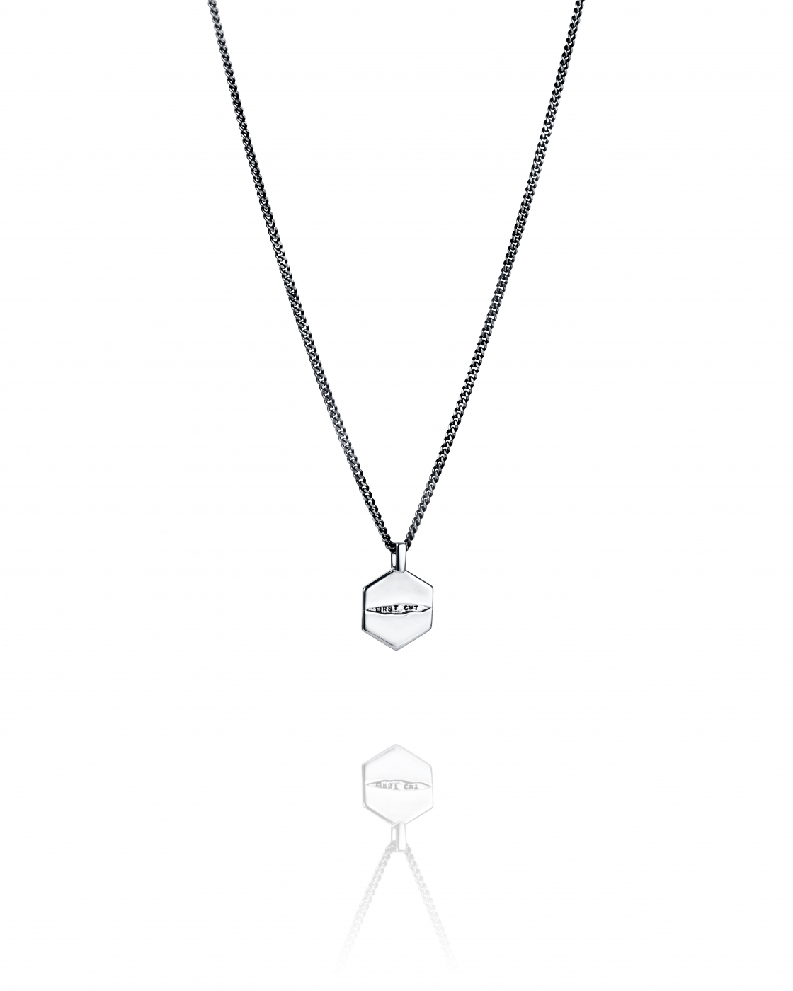 Halsband i återvunnet sterlingsilver med ett hänge dekorerat med texten First Cut.