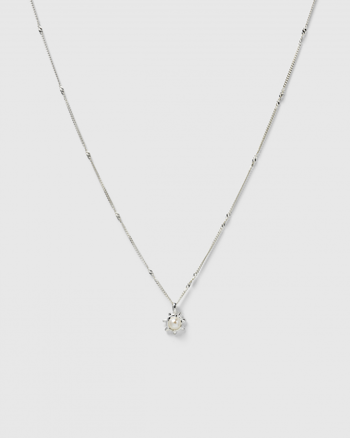 Florentina Pearl Necklace har en unik kedja med snurrade länkar och en blomformad berlock med en infattad odlad sötvattenspärla. Handgjort i 925 sterlingsilver, 100% återvunnet.