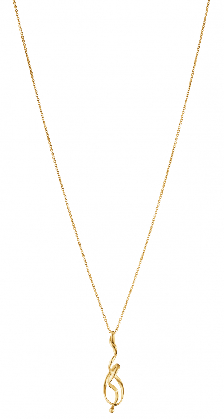 Vivianna Torun Bülow-Hübe är känd för sitt naturinspirerade formspråk och var den första kvinnliga silversmeden att öppna egen verkstad i Sverige. Hennes Forget-Me-Knot-hänge från 1971 är format av en enda tråd i gult guld och speglar hennes syn på smyckesdesign: enkel, skulptural och naturligt elegant.