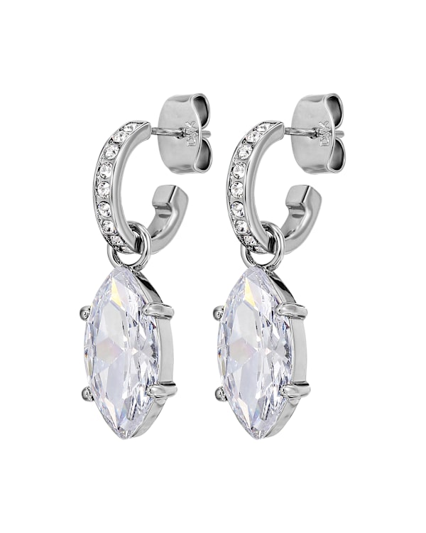JUNIPE Klassiska örhängen med avtagbart och vändbart hänge. Här i en variant av vita klara kristaller. Smycket är tillverkat i mässing med en hållbar silvertonad IP plätering. Stift i kirurgiskt stål. Total längd ca 25 mm. Handgjort. Dansk design. Fritt från kadmium, nickel och bly.