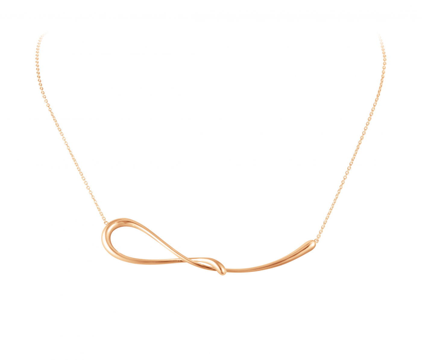 Detta eleganta halsband har en flytande formad krullning av 18k roséguld som är uppträdd mellan en delikat kedja. Det är en skapelse av smyckesdesignern Jacqueline Rabun som en del av hennes Mercy-kollektion för Georg Jensen. Detta smycke symboliserar tidens flödande gång och alla dess oväntade vändningar, och fångar en känsla av mjuk rörelse.