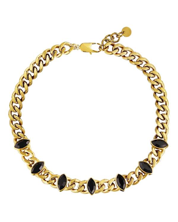 PUNICA är ett djärvt, kort halsband som ligger vackert i halsringningen med sin längd på 42 cm + 5 cm förlängningskedja. Super rock'n'roll och samtidigt chunky elegant Kedjan är designad i polerat stål, och de sju inlagda navettformade kristallerna överraskar och fascinerar. Bär Punica kedjehalsband med en T-shirt eller aftonklänning som du vill. Här visas guldfärgad version med stenar i svarta toner. DANSK DESIGN - fri från kadmium, bly och nickel.