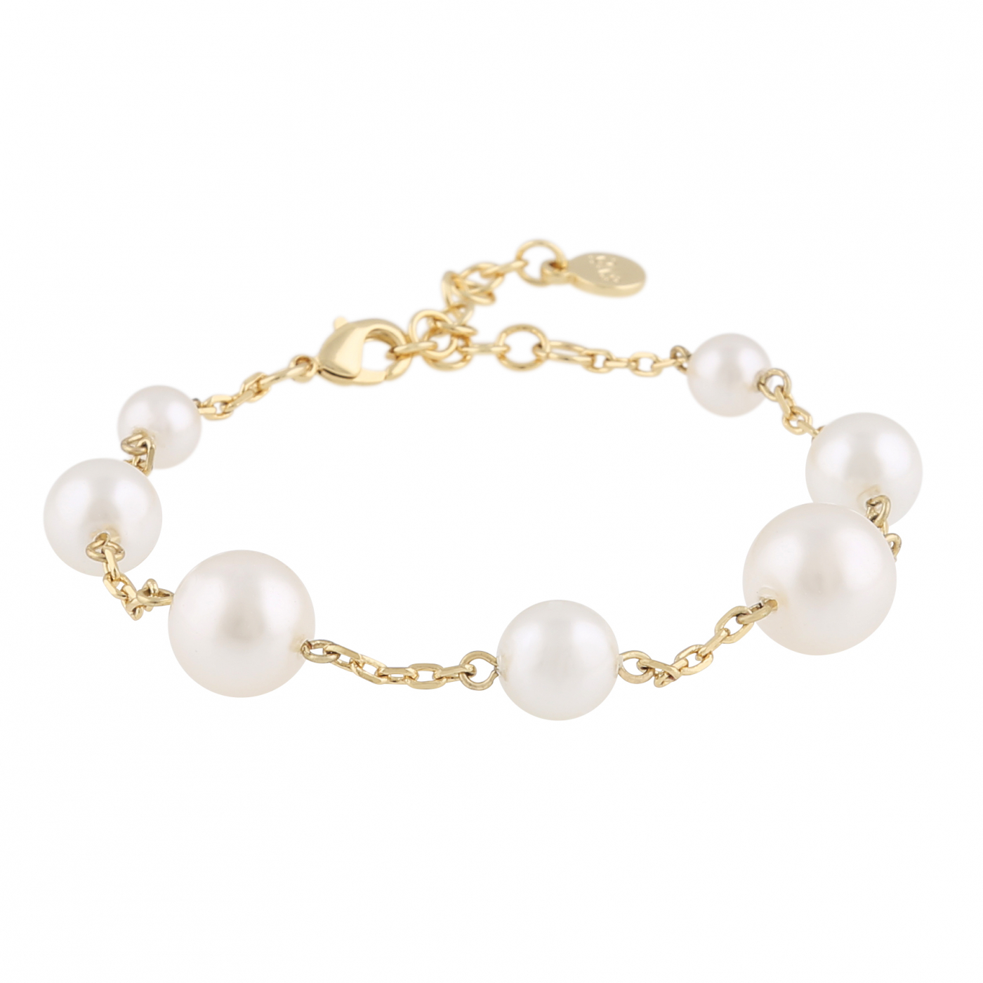 Armbandet är gjort av guldpläterad mässing och prytt med glaspärlor i storlekarna 6 mm och 8 mm, vilket ger en sofistikerad och charmig look. Armbandet är justerbart och har en längd mellan 16 och 18,5 cm.