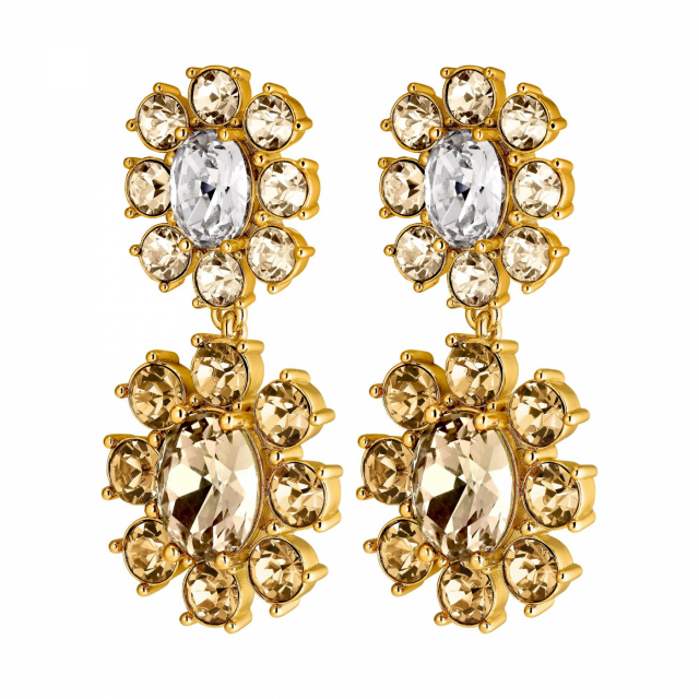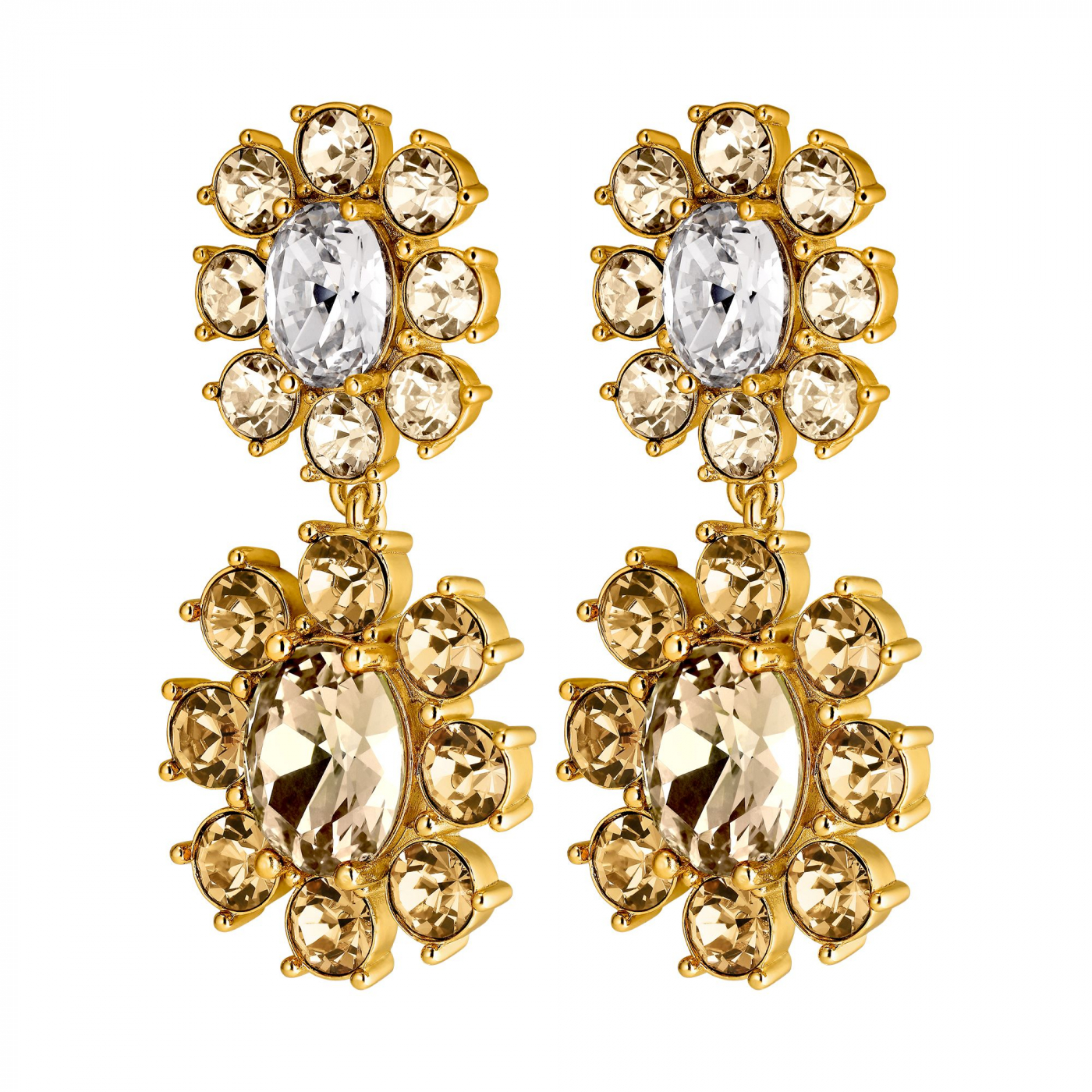 Lina- ett extravagant, romantiskt och helt fantastiskt örhänge .Bilden talar för sig själv. Letar du efter något speciellt snyggt så har du det här. Stift i kirurgiskt stål. Längd 55 mm. Material: Polerad mässing med en IP plätering. Vackra gnistrande gyllene kristaller. Dansk design. Handgjort. Fritt från kadmium, bly och nickel.