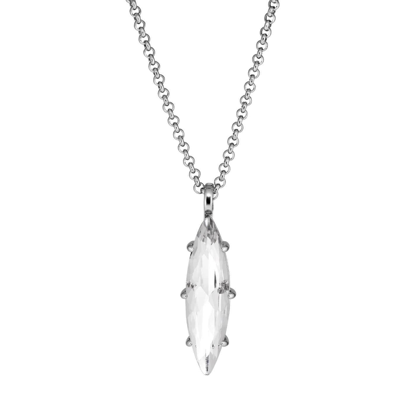 TAKESHI är namnet på detta enkla men übercoola långa halsband på totalt 80 cm. Utrustat med ett litet karabinlås i stål och en superelegant, slät bladformad fasetterad glittrande kristall, och infattat i en klassisk juvelinfattning. Detta halssmycke kommer garanterat att väcka uppmärksamhet. Nickelfri dansk design - från DYRBERG KERN.